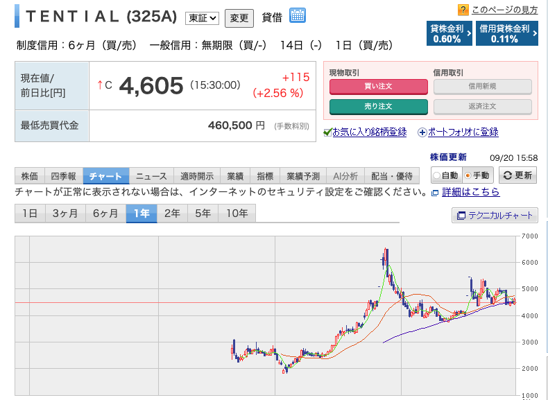 TENTIALは2025年から上場しましたが、こんな感じで9/19現在の株価も好調です。